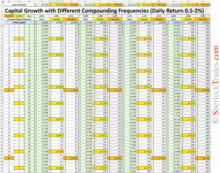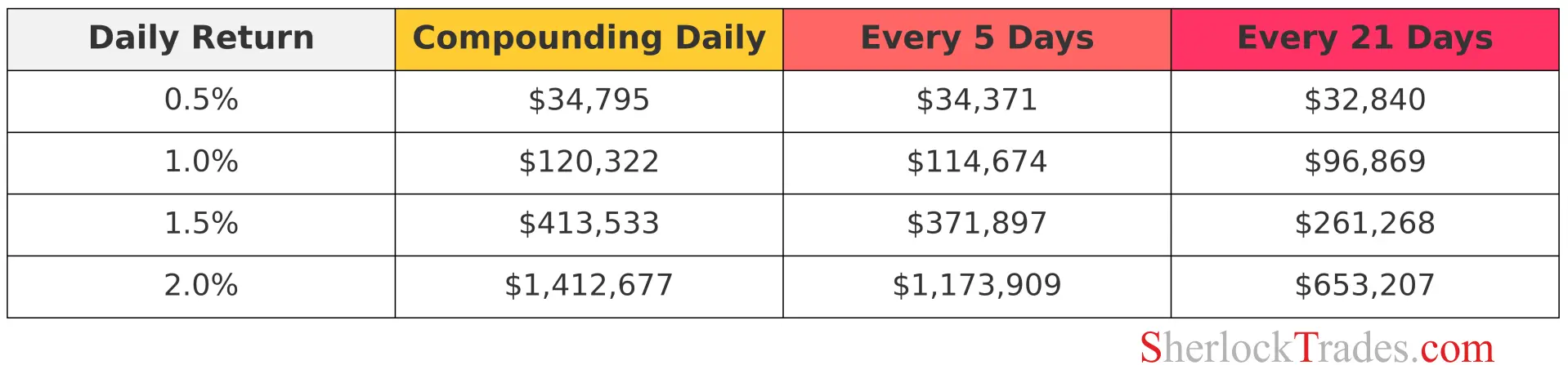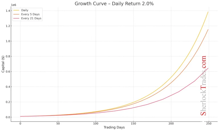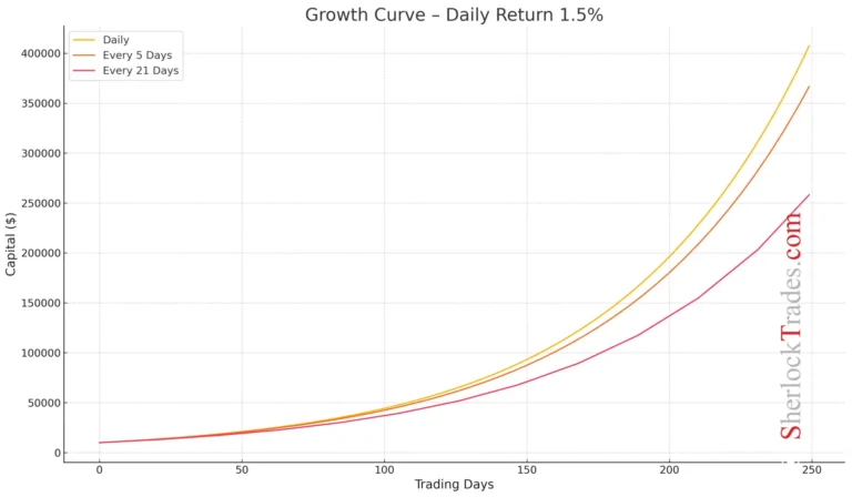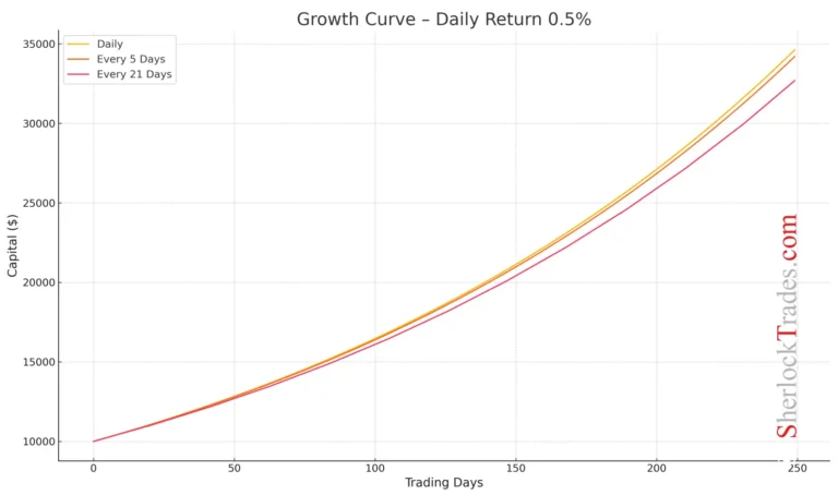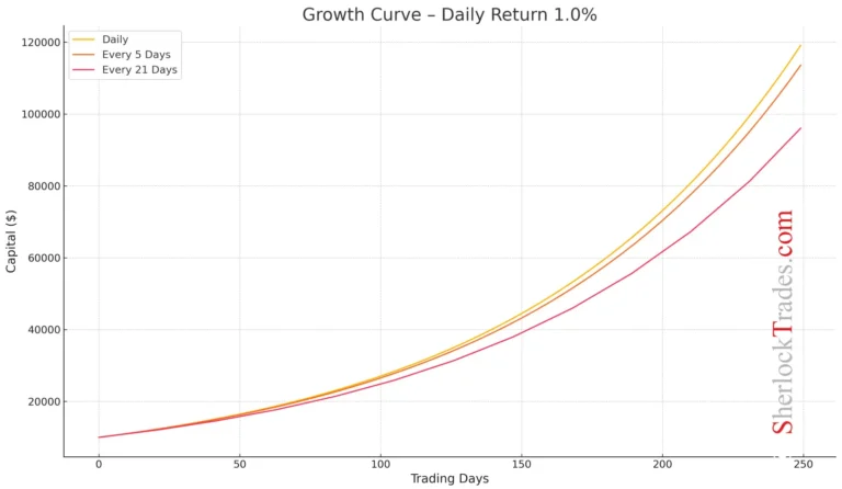 This table expands on the earlier comparison, showing in detail how reinvesting profits every 1, 5, or 21 days affects the final result. It’s an ideal tool for Traders who want to model different scenarios and better understand the power of compound interest depending on the consistency of their actions.