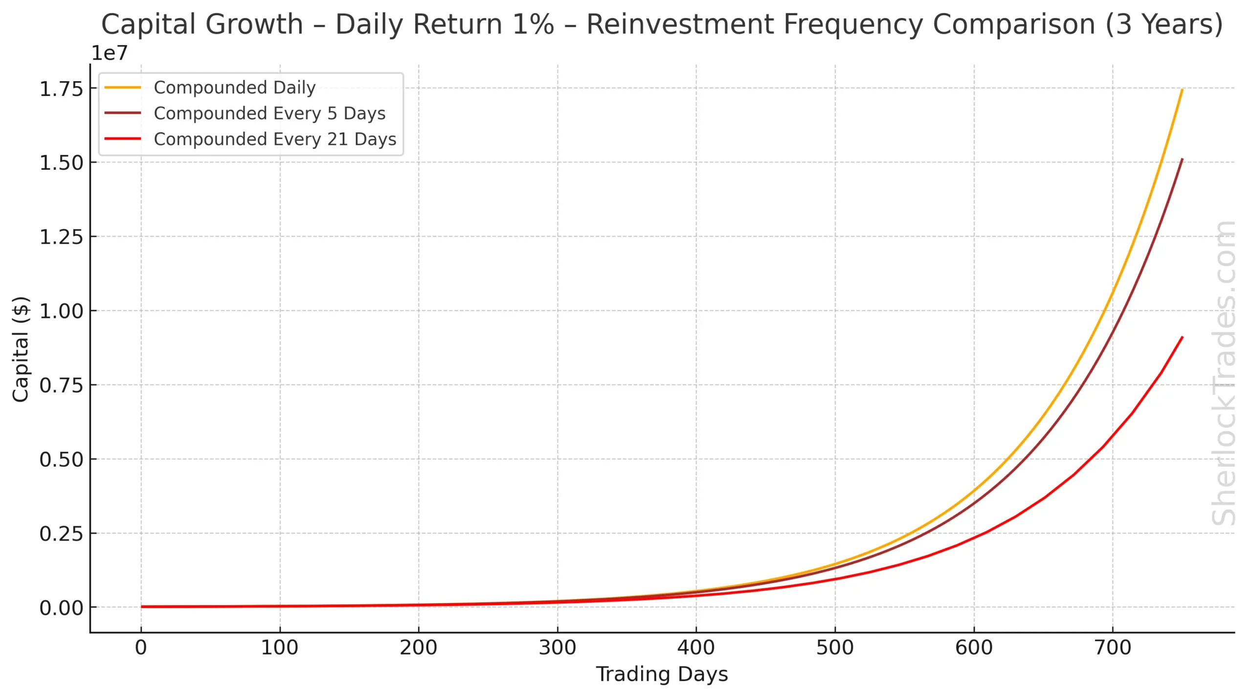 The more frequent the reinvestment, the faster the capital grows. Even with a moderate daily profit (0.5%), the differences between daily and monthly position updates after 250 days are clear.