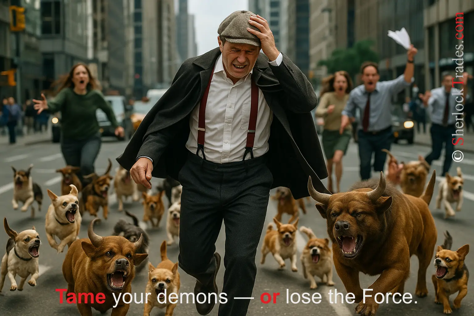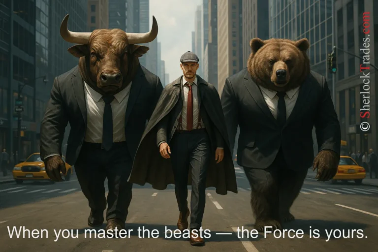 The graphic refers to the chapter where I discuss trading effectiveness depending on the Trader’s emotional state. It symbolizes inner strength and complete control over the market. The bull and the bear become allies of the Trader, who has achieved calm, emotional control, and maximum focus.