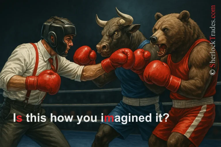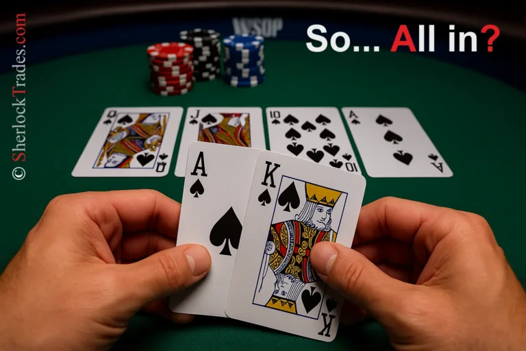 The scene symbolizes a key moment of decision: go “all in” or stop and reconsider the situation. At first glance, everything looks perfect – strong cards, full readiness to enter. But a careful Trader will notice that something doesn’t add up. The market, just like this game, can be manipulated. The illustration warns: a strong entry signal is not enough – you must be able to assess whether it’s even worth playing and whether the game you want to go “all in” on isn’t a trap.