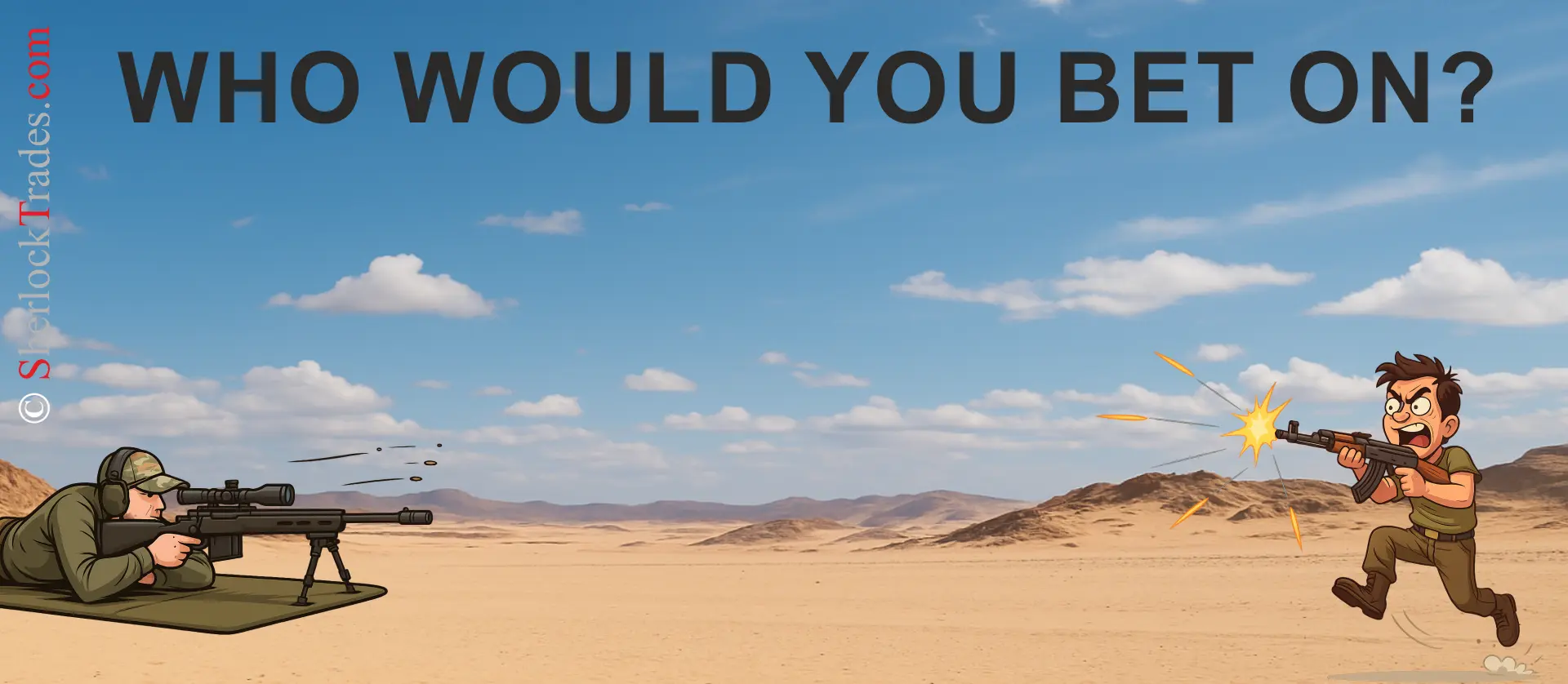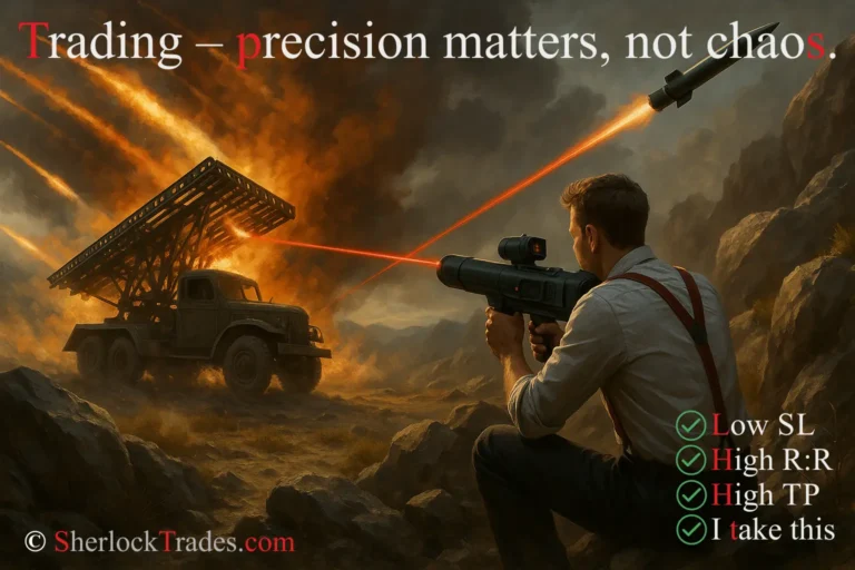 The illustration contrasts an emotional, chaotic approach (Katyusha) with cold precision in trading. The Trader with the launcher symbolizes a well-prepared trade with clearly defined parameters: low SL, high R:R, and precise TP. The image reinforces the main idea of the chapter – effectiveness in trading is a repeatable, statistically proven strategy.