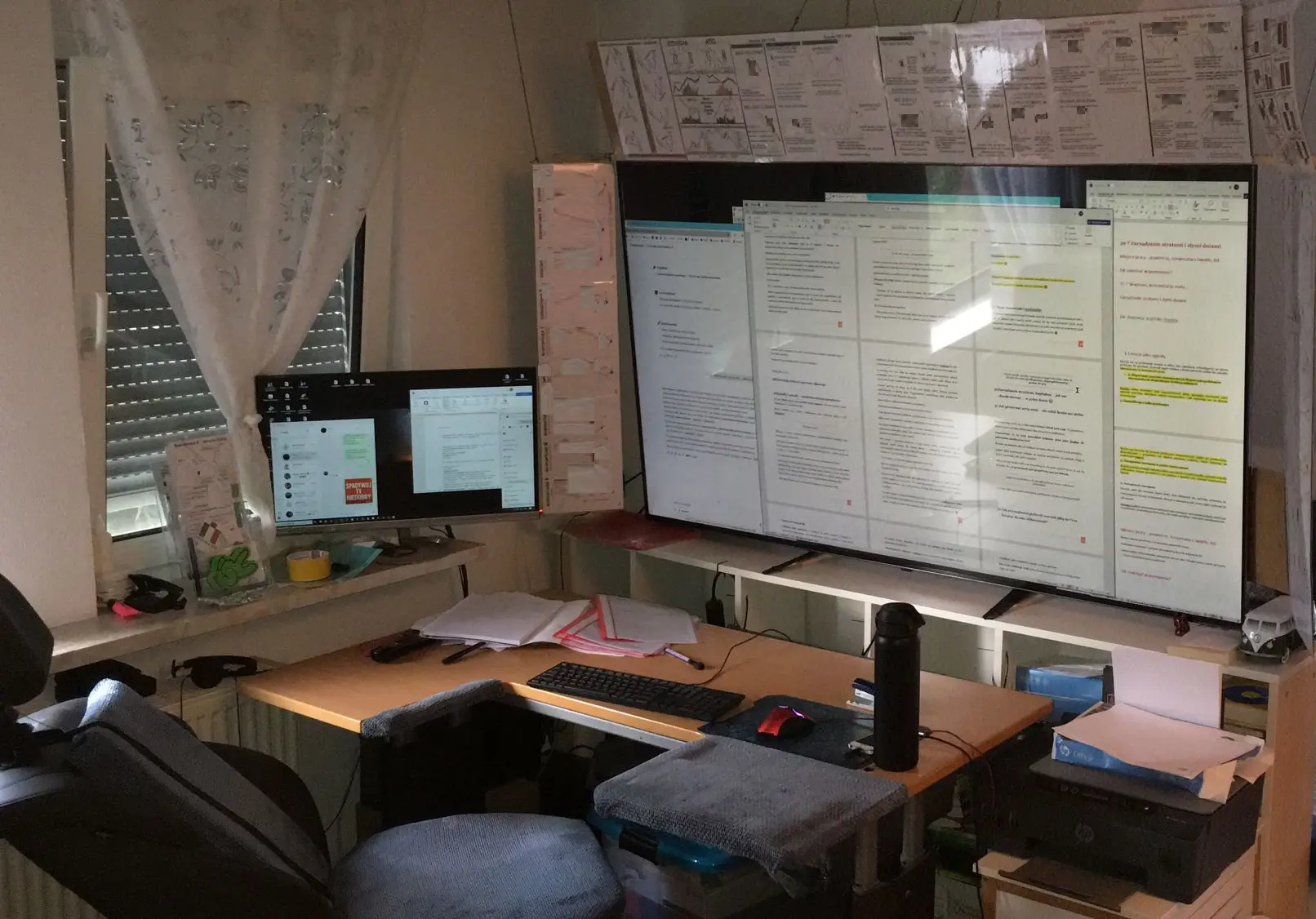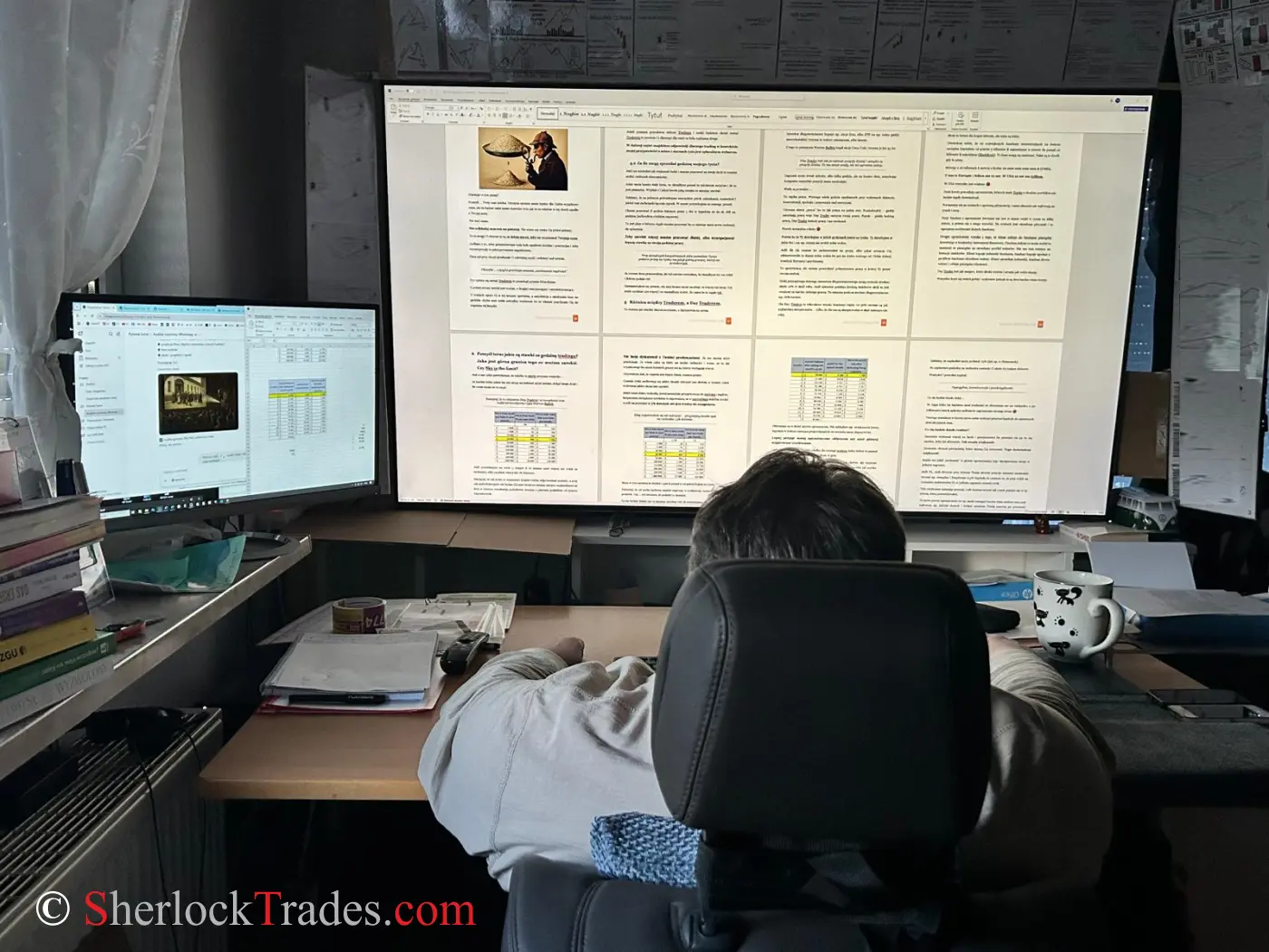 This is the full view of my workspace. The main monitor is 75”, with a distance of about 150 cm from my eyes. On the left side is a smaller 27” screen. This setup is very comfortable – there’s no problem with lack of space, charts being too small, or figuring out how to arrange chart windows on the monitors. One large monitor offers incredible working comfort.