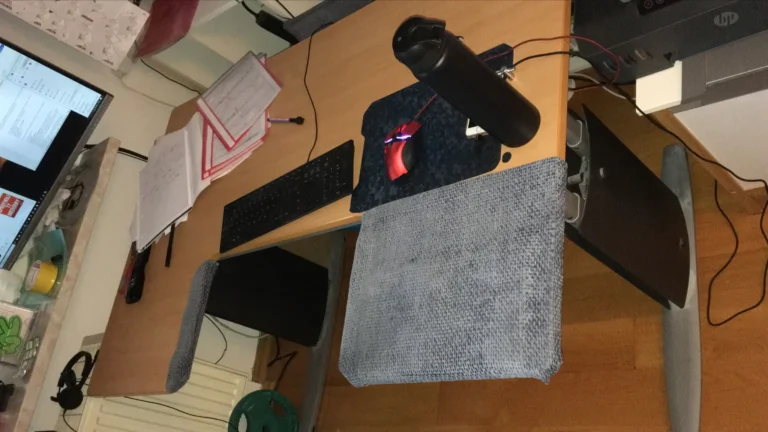 I tested many different configurations, and only this one turned out to be fully satisfying. A height-adjustable desk and a desktop shape that provides good arm support… The setup works so well that I finally stopped thinking about what else could be improved.