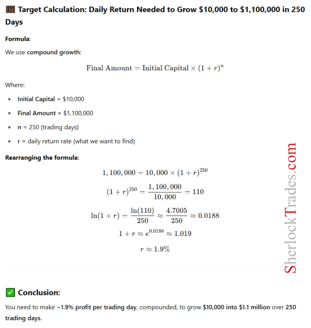 Turning $10,000 into over a million in a year requires consistent gains of around 1.9% per day – mathematically possible, but extremely difficult in practice.